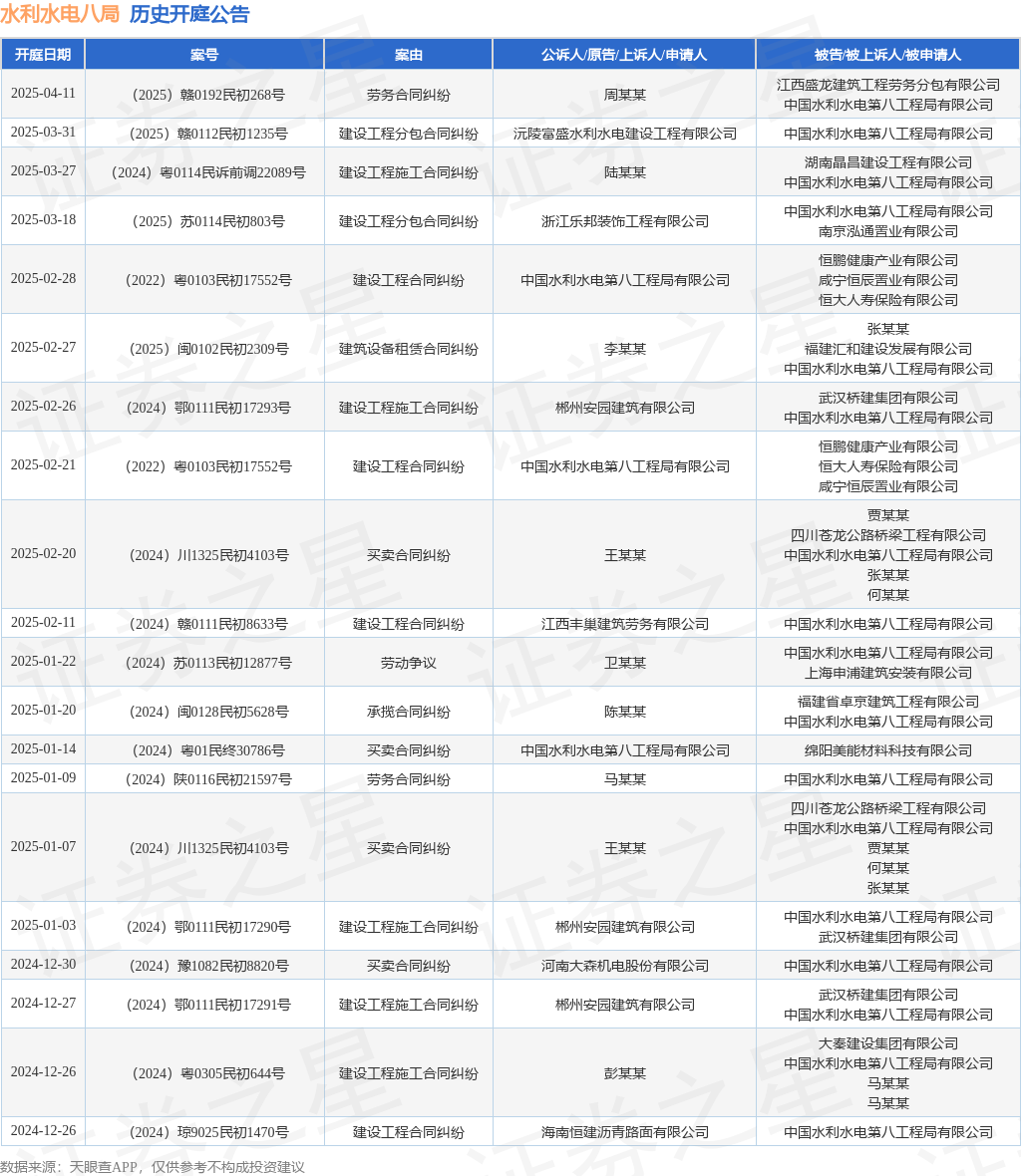 本站消息,根据天眼查APP显示,近日公布了一则中国水利水电第八工程局有限公司作为被告/被上诉人的开庭公告,详细内容如下: